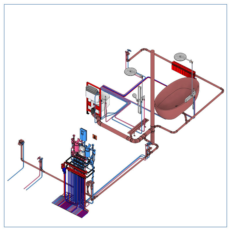 • Проектирование систем отопления, водоснабжения и канализации охватывает распределение и расчёт трубопроводов, создание эстетичного коллекторного узла, полный подсчет материалов.
